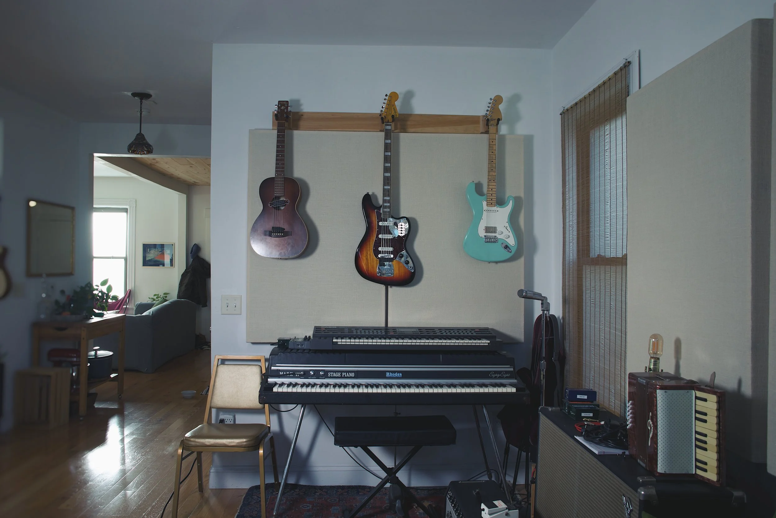 Monitoring is a Neumann speaker system with KH80 speakers and KH750 sub. The room is acoustically treated and monitors aligned using Neumann’s calibration system.